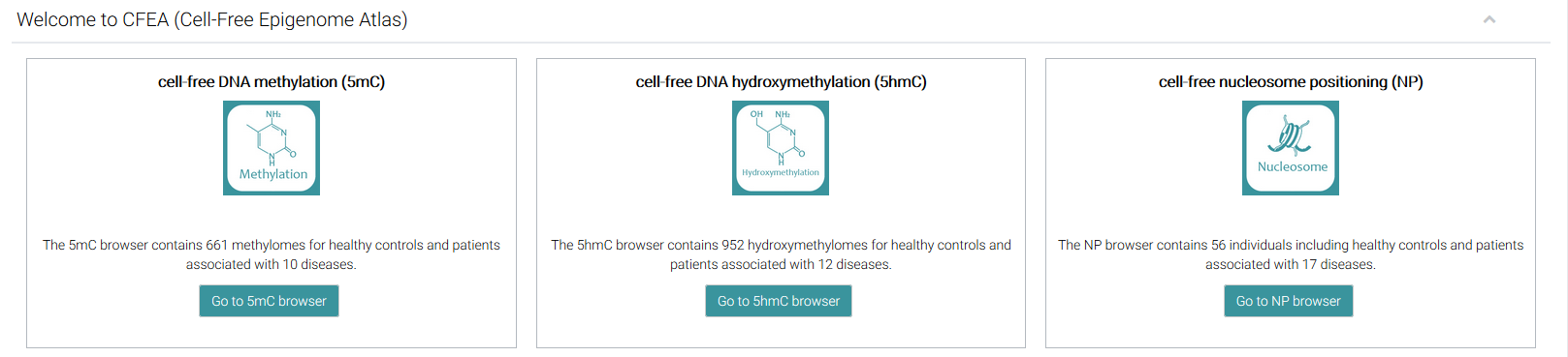 Circulating cell-free DNA-based epigenetic assays involved in cfDNA methylation (5mC) [Nature 2018, PMID: 30429608], cfDNA hydroxymethylation (5hmC), [Cell research 2017, PMID: 28925386] and cfDNA nucleosome positioning (NP) [Nature Genetics 2016, PMID: 27571261], which were shown to be valid strategies for detecting various diseases, especially cancer. CFEA data portal integrating the human cell-free epigenomes of individuals with various conditions including health and disease states. The current release of CFEA contains the cell-free epigenomes of 1645 individuals involved in more than 80 billion raw sequencing reads. In order to keep the data processed and stored in a consistent manner, CFEA developed benchmarking pipelines aiming at a broad range of experimental methods to efficiently process handpicked datasets from raw files. CFEA provides easy-to-use and intuitive web interfaces and manuals for users to browse and obtain interesting data. The CFEA could be a valuable resource for accelerating the discovery and validation of liquid biopsy biomarkers to improve the diagnosis and outcomes of patients with complex diseases.